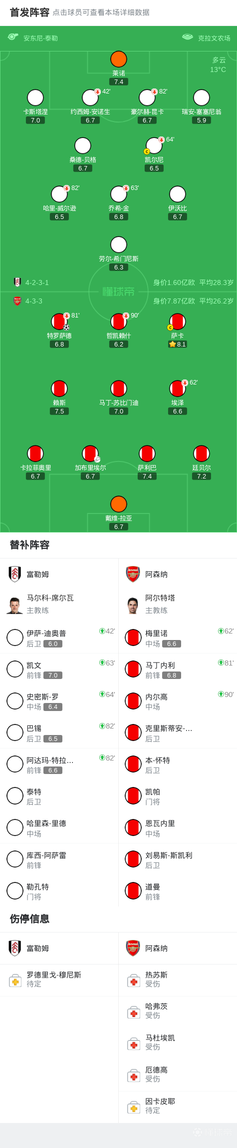比赛进行至第42分钟,富勒姆队进行人员调整,安诺生因伤退场,迪奥普替补登场